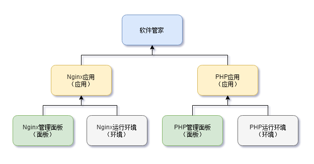 下图以 Nginx 和 PHP 为例,描述了应用、面板和环境的关系: