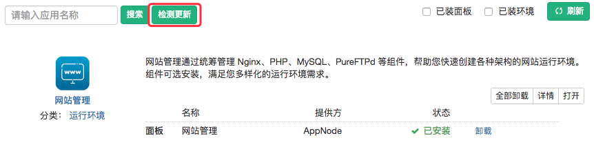 点击头部的“检测更新”按钮即可开始: