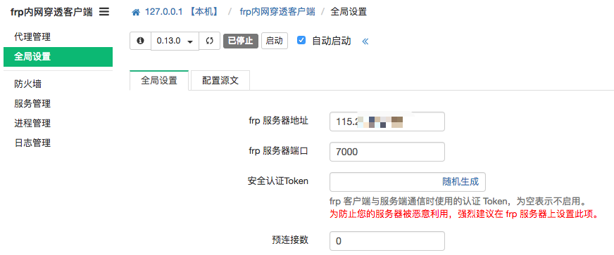 进入全局设置页面,设置frp服务器地址和监听端口,(这边的值和 配置frps服务器 步骤中的值一致)