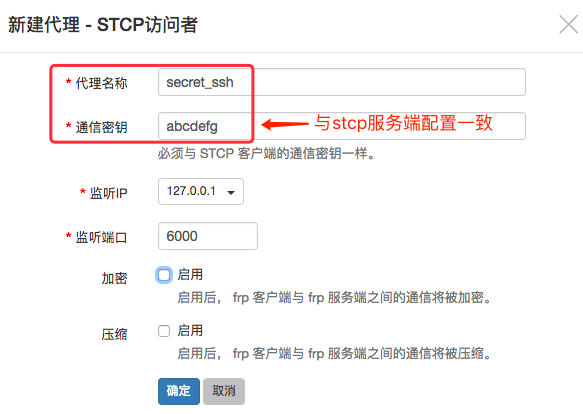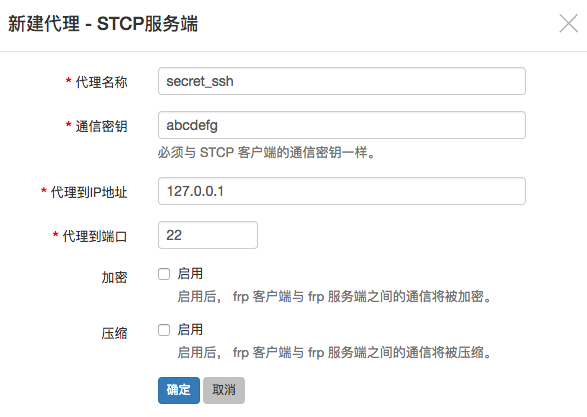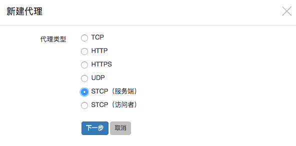 进入“代理管理”,点击“新建代理”,“代理类型”为 STCP(服务端):