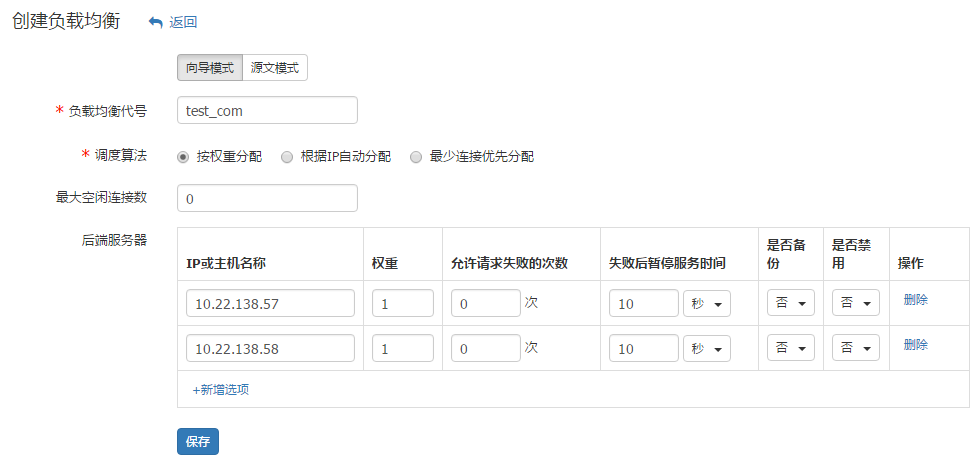 在这一步中,我们要在负载均衡节点上创建负载均衡器,并将上一步中创建的后端服务器的两个 Web 站点加入负载均衡器中。