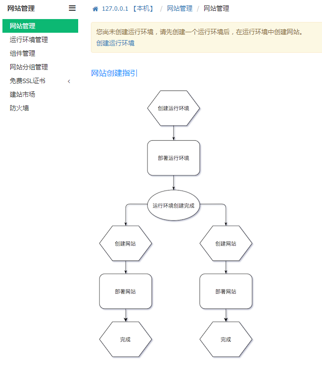 首次进入【网站管理】时,会提醒您“您尚未创建运行环境,请先创建一个运行环境后,在运行环境中创建网站。”,如图: