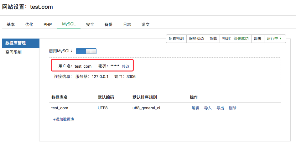 可以在"网站设置"中的"MySQL"-"数据库管理"中点击"修改"按钮,查看账号,密码信息;