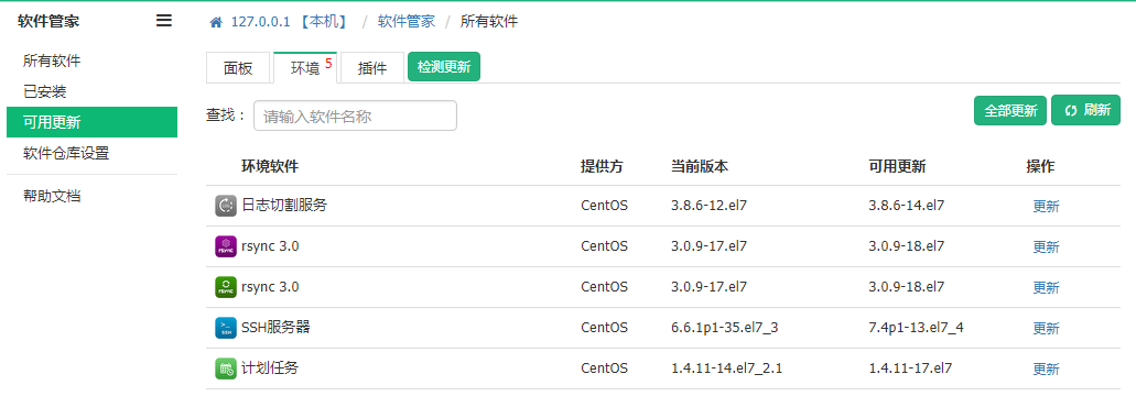 进入受控端的【软件管家】,点击“可用更新”,在“环境”标签页中可以看到目前可以升级的软件: