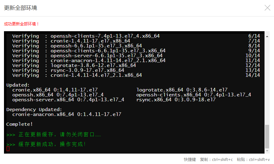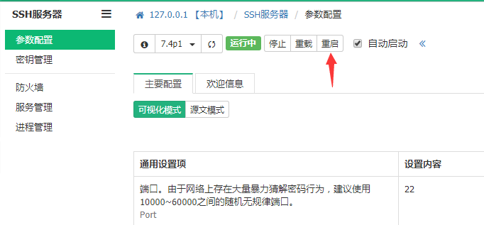 请注意,这些软件中可能有一些已经在运行,在升级完成后,还要手动重启下他们的对应服务才会生效,可以在它们对应的面板中重启,如【SSH服务器】:
